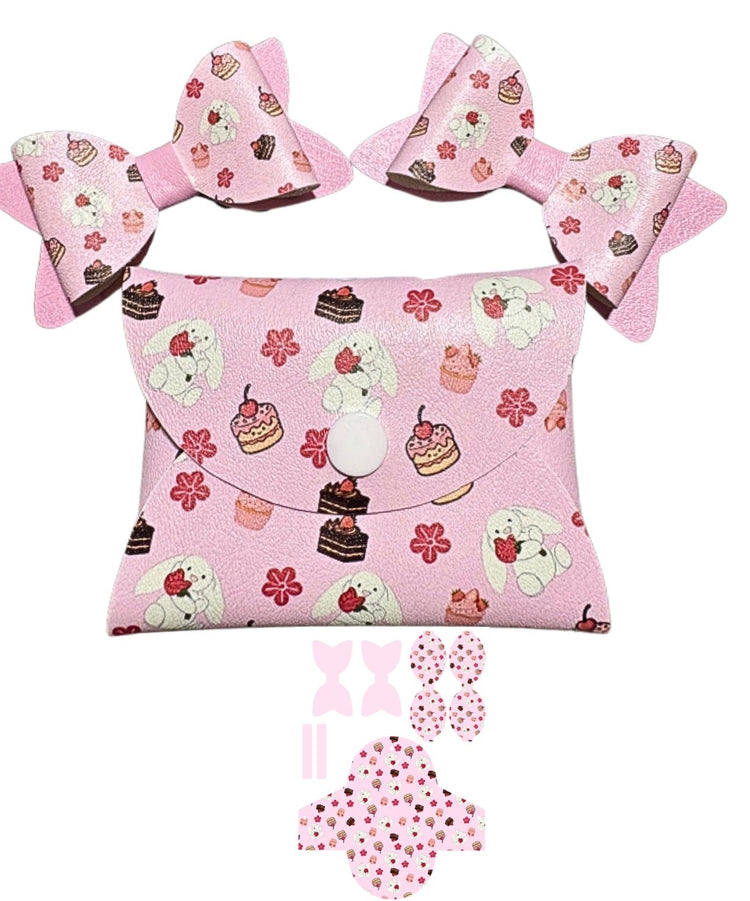 No sew cut around in house leatherette printed coin purse and two matching bow loops tails and centre strips