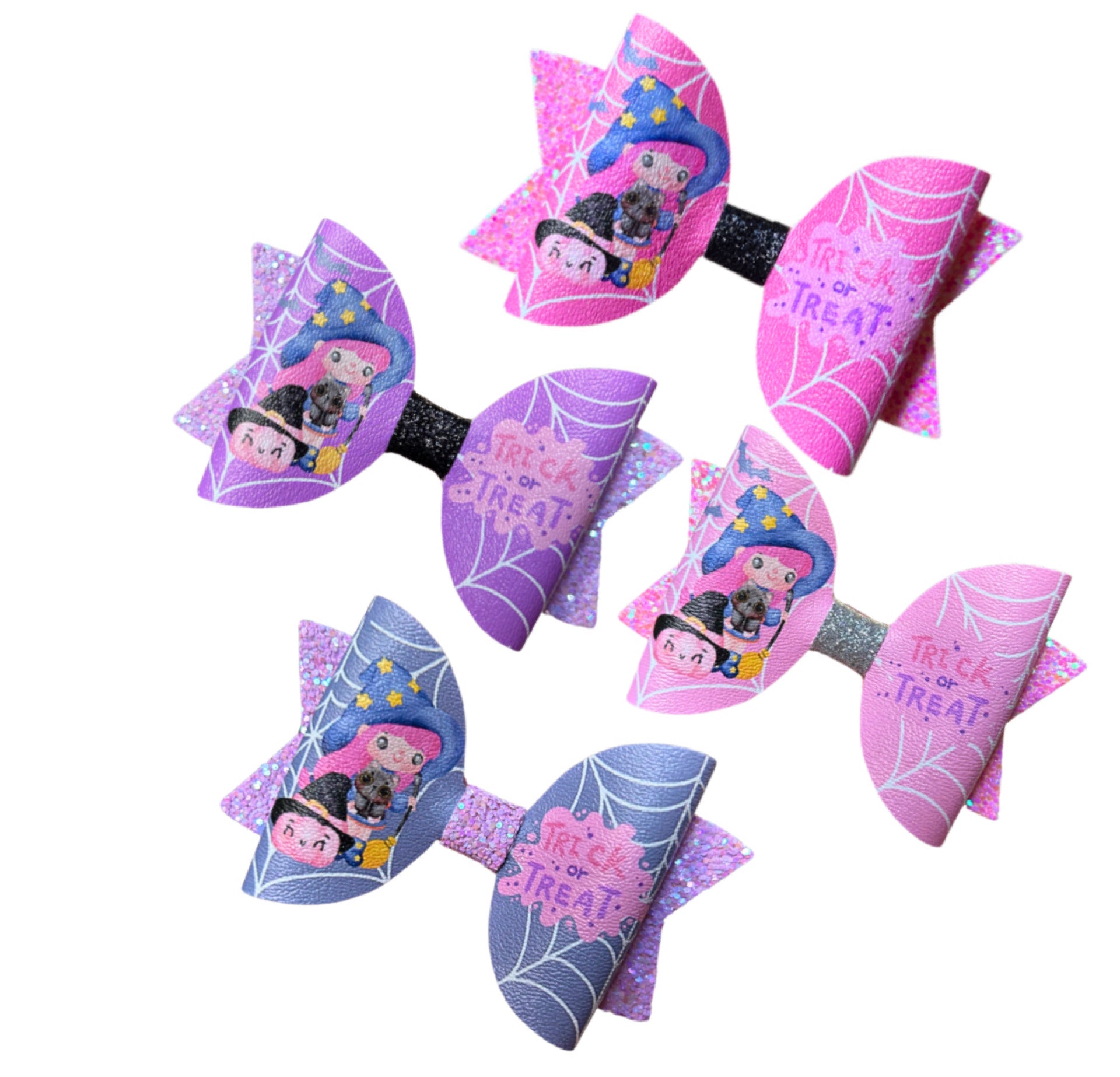 7 x Cutest witch assorted colours pre printed in house leatherette bow loops 3.5”